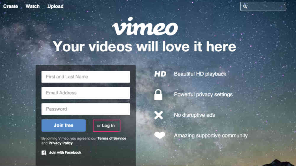 Cliquez sur log in pour vous connecter à votre compte Vimeo
