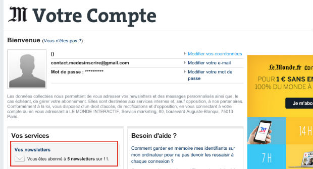 Si vous êtes inscrit aux newsletters du journal Le Monde, il faudra vous rendre sur le site pour gérer vos paramètres de Newsletters.